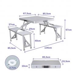 The Marbueno folding table set, consisting of a table and four seats, is the perfect solution for enjoying outdoor activities anywhere, be it in the garden, at the beach, or camping. The folding table is made of aluminum with a gray finish, featuring a modern design that fits any outdoor setting, creating a comfortable and functional space. Its central hole allows for the placement of an umbrella, providing sun protection, making it ideal for sunny days. In terms of maintenance, this set is easy to clean with a damp cloth, avoiding abrasive cleaners that could damage its materials. To preserve quality, it is advisable to store it in a dry place when not in use. The table dimensions are 136 cm long, 85 cm wide, and 67 cm high, providing ample space for sharing moments with family and friends. It includes a safety locking system for added stability.